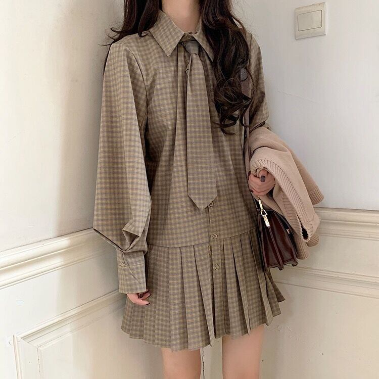 ワンピース チェック柄 ショート丈 シャツワンピ プリーツ カレッジスタイル カジュアル RB-R3-04-SA03-0014