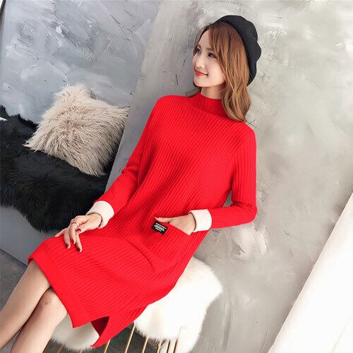 ワンピース ニット 長袖 ハーフハイカラー ミディアム丈 ルーズ カジュアル RB-R3-04-SA03-0015