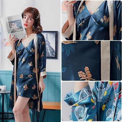 韓国風 パジャマ 夏 2点セット 前開き ガウン キャミ ワンピース 長袖 部屋着 ルームウェア RB-R3-04-SA03-0061