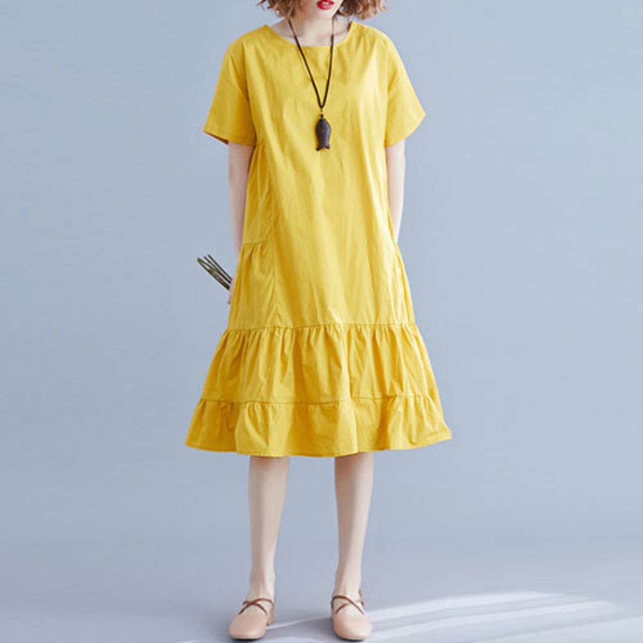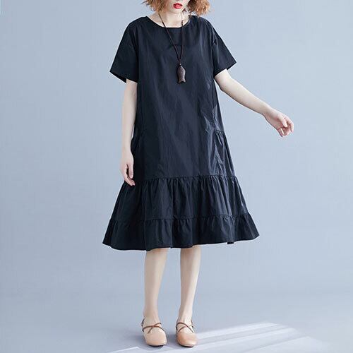 韓国風 ワンピース 無地 春 夏 半袖 フリル スリット ロング Tシャツ コットン ポリエステル ミモレ丈 無地 レディース 30代 40代 RB-R3-04-SA03-0087