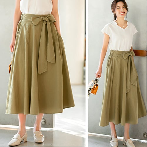 スカート ロング丈 ハイウエスト フレア リボン カジュアル きれいめ 大人 無地 RB-R3-04-SA03-0070
