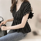 シャツ トップス V型襟 フレアスリーブ ウェストゴム ストライプ 切り替え ポリエステル 通勤 オシャレ フリルデンザイン カジュアル 夏 20代 30代 RB-R3-04-SA03-0092