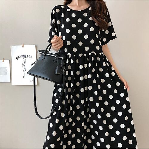 ワンピース レディース 半袖 マキシ丈 ドット柄 フレアスカート お出かけ RB-R3-04-SA03-0106