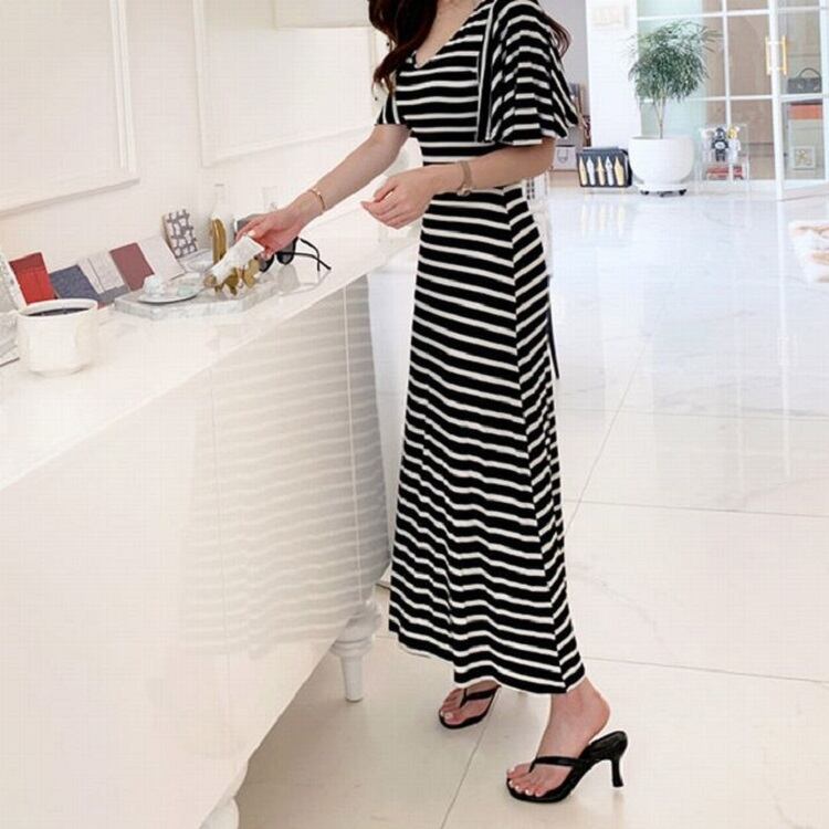 夏 20代 30代 40代 くすみカラー ニットワンピース レディース ボーダー ロング丈 フレア リゾート ルームウエア RB-R3-05-MT04-0011