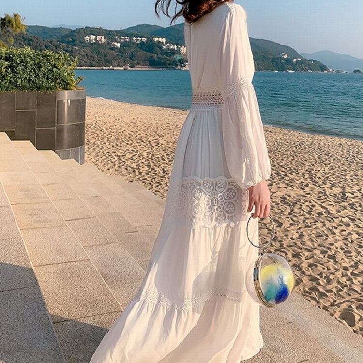 夏 20代 30代 40代 くすみカラー ワンピース レディース レース フレア ロング丈 九分袖 Vネック ロング丈 リゾートビーチ 旅行 RB-R3-05-MT04-0020