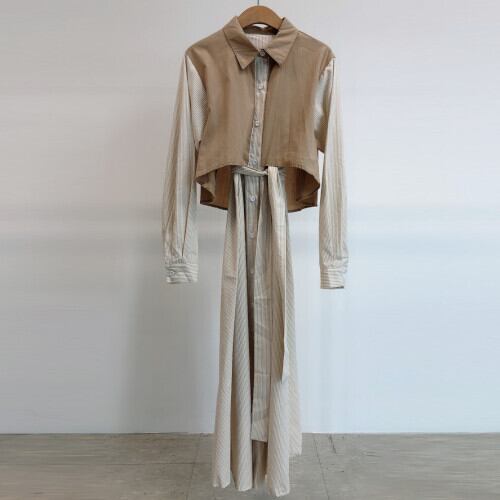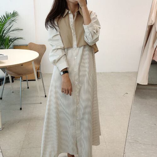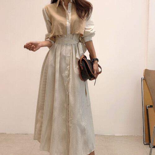 ワンピース ベージュ ベスト重ね着風 シック フレアスカート カジュアル ハイウエスト長袖 ポロカラー ロング丈 夏 20代 30代 40代 くすみカラー RB-R3-09-SA04-0036