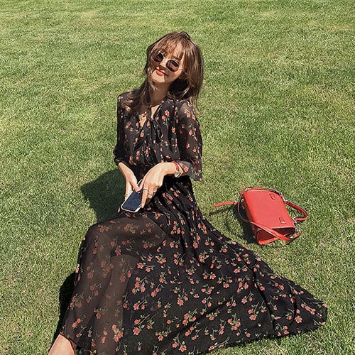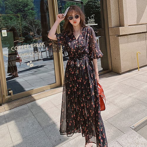 ワンピース ブラック アプリコット 花柄紋様 Vネック 五分袖 ジュアル ヤングミセス ボディーオーバー ロング丈 清潔感 避暑 夏 20代 30代 40代 くすみカラー RB-R3-09-SA04-0043