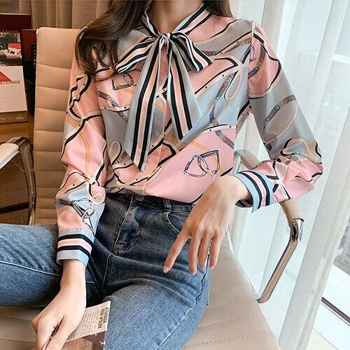 韓国風 ブラウス グリーン ピンク ポリエステル リボンネック カラフルプリント柄 ビジカジ ヤングレディース 長袖 ゆったり感 夏20代 30代 40代 くすみカラー RB-R3-09-SA04-0046