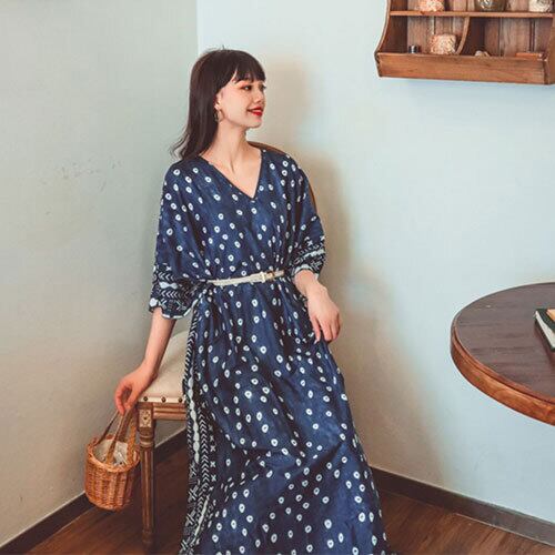 ワンピース ブルー Vネック カジュアル エスニック風 ゆったり感 コットン シフォン ロング丈 ウエストベルト付き ヤングレディー 夏 20代 30代 40代 くすみカラー RB-R3-09-SA04-0057