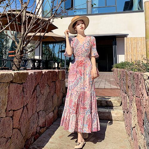 ワンピース ピンク フレアスカート シフォン 爽やか 花柄 Vネック 半袖 ロング丈 ポリエステル ヤングレディー カジュアル 清潔感 避暑 夏 20代 30代 40代 くすみカラー RB-R3-09-SA04-0059