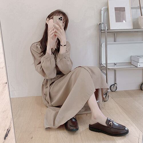ワンピース グレーグリーン ベージュ マキシ丈 ウエストバンド付き ポロカラー ヤングレディー 長袖 ゆったり感 カジュアル 清潔感 夏 20代 30代 40代 くすみカラー RB-R3-09-SA04-0067