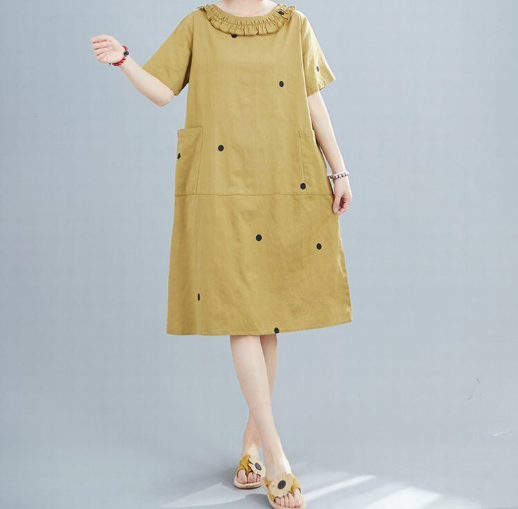 韓国風 夏 20代 30代 40代 くすみカラー ワンピース レディース ドット柄 フリル リネン チュニック 通勤 通学 RB-R3-05-MT04-0044