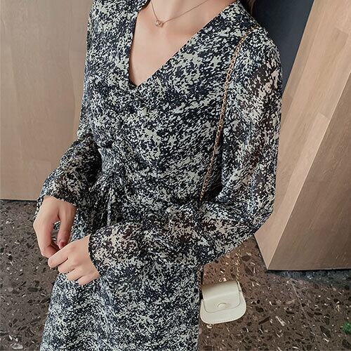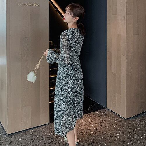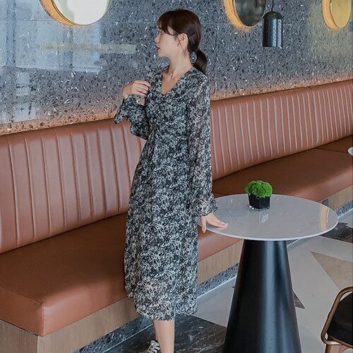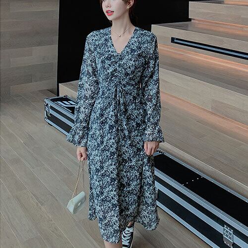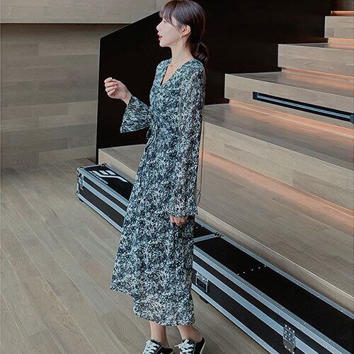 ワンピース ネイビーブルー 爽やか カジュアル フレンチスタイル風 ヤングレディー 長袖 Vネック Aライン ハイウエスト ロング丈 ホーンスリーブ袖 シフォン 花柄紋様 清潔感 薄手 夏 20代 30代 40代 くすみカラー RB-R3-16-SA04-0019