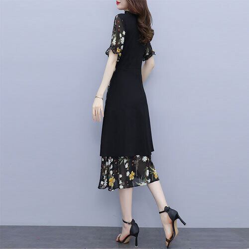 ワンピース ブラック ハイウエスト シフォン シックな佇まい 華やぎ レース装飾 花柄紋様 ヤングレディー ミドル丈 ヤングミセス 長袖 夏 20代 30代 40代 くすみカラー RB-R3-16-SA04-0024
