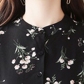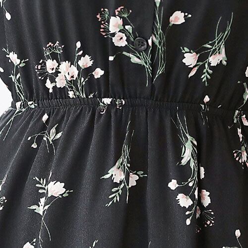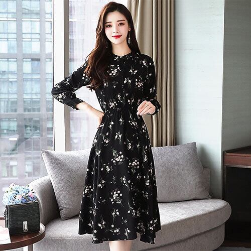 ワンピース ブラック スタンドカラー 袖ステッチボタン付き ポリエステル スリムウエスト 花柄紋様丈 ミドル丈 シックな佇まい 長袖 ヤングレディー カジュアル 夏 20代 30代 40代 くすみカラー RB-R3-16-SA04-0027