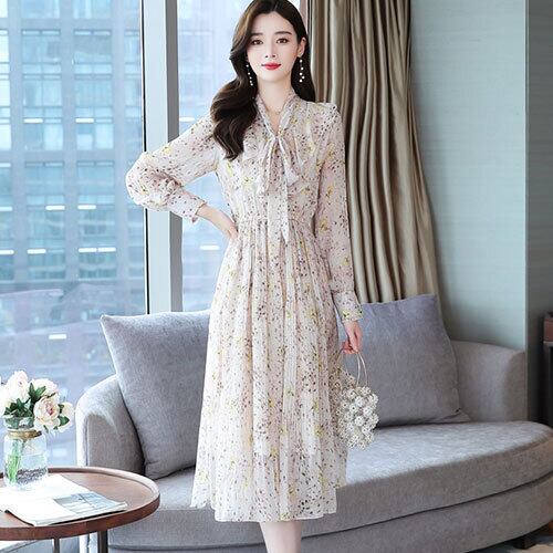 ワンピース ベージュ シフォン 花柄 レディース 新作 長袖 きれいめ オシャレ 通勤 結婚式 お出かけ 大人 夏 20代 30代 40代 くすみカラー RB-R3-16-SA04-0035