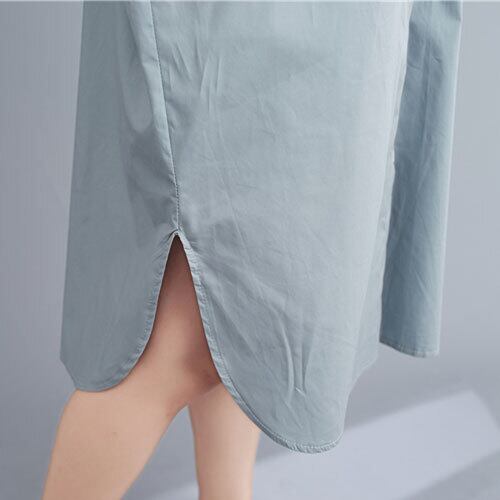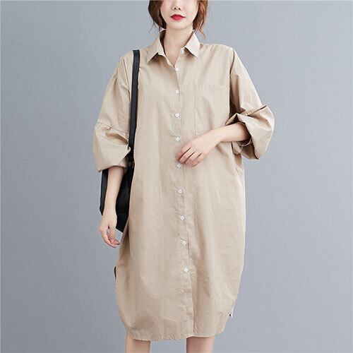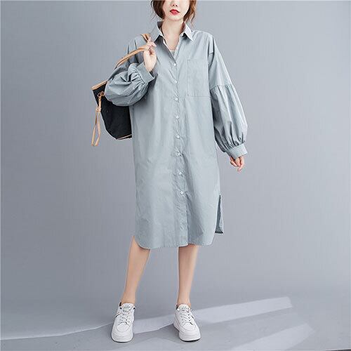 ワンピース カーキ ライトブルー ヤングレディー 洗練スタイル カジュアル 長袖 大きいサイズ リラツクス感 ロングシャツタイプ ゆったり感 ミディ丈 ポロカラー ランタンスリーブ袖 軽快感 気軽さ 夏 20代 30代 40代 くすみカラー RB-R3-16-SA04-0050