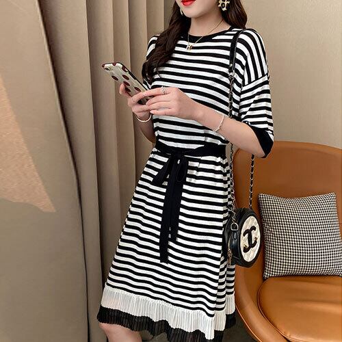 ワンピース ブラック ポリエステル 着痩せ ヤングレディー 爽やかな カジュアル 半袖 涼しげ ボーダー ウエストリボン装飾 清潔感 軽快感 ミディ丈 ラウンドカラー ゆったり感 夏 20代 30代 40代 くすみカラー RB-R3-04-SA04-0046