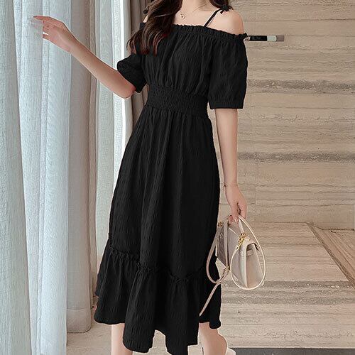 ワンピース レディース レッド ブラック ポリエステル 無地 オフショルダー キレイめ 膝丈 半袖 Aライン 着やせ 新作 夏 20代 30代 40代 くすみカラー RB-R3-04-SA04-0049