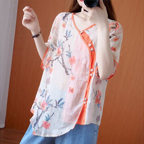 ブラウス オレンジ ブルー アンシンメトリー裾 清潔感 カジュアル 軽快感 ゆったり感 五分袖 ヤングレディー 爽やか ルーズトップスシャツ 清涼感 涼しげ 花柄 夏 20代 30代 40代 くすみカラー RB-R3-04-SA04-0054