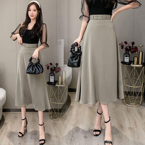 レディース スカート ハイウエスト ミモレ丈 フレアスカート おしゃれ ゆったり グレー ブラック 夏 20代 30代 40代 くすみカラー RB-R3-04-SA04-0027