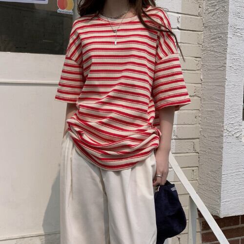 韓国風 Tシャツ ゆったり レディース カットソー ボーダー 半袖 クルーネック バカンス 夏 20代 30代 40代 くすみカラー RB-R3-04-SA04-0077