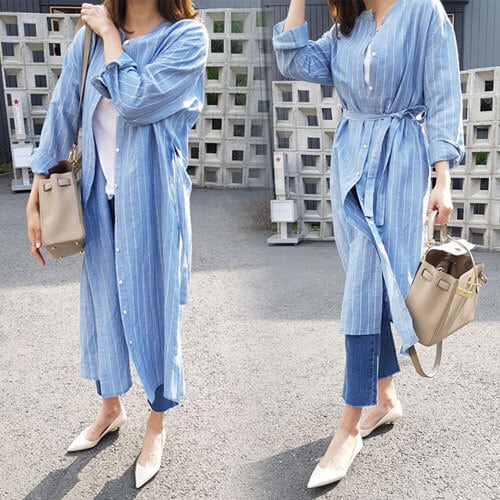 ワンピース レディース ストライプ ブルー 長袖 シャツワンピース ロング丈 着痩せ オシャレ スリーブ シャツロング 夏 20代 30代 40代 くすみカラー RB-R3-04-SA04-0082