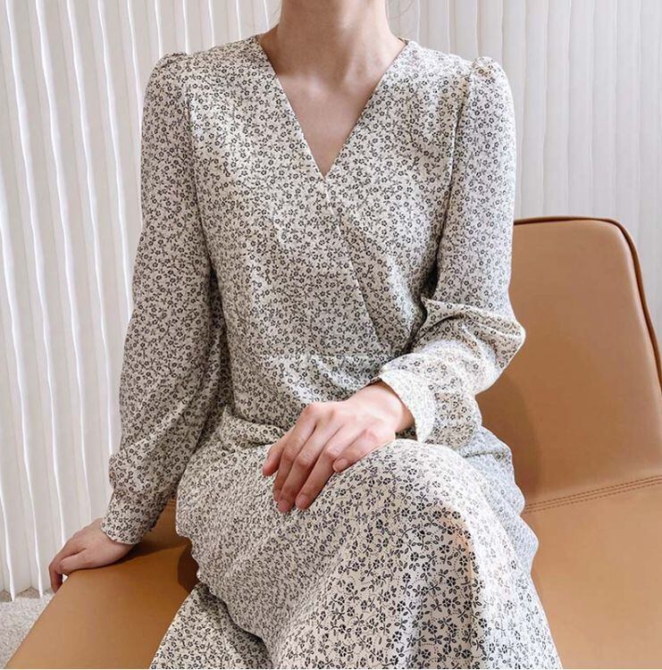 夏 20代 30代 40代 くすみカラー ワンピース レディース プリーツ シャツワンピース 小花柄 カシュクール Vネック 長袖 ロング丈 Aライン お呼ばれ RB-R3-08-MT04-0042