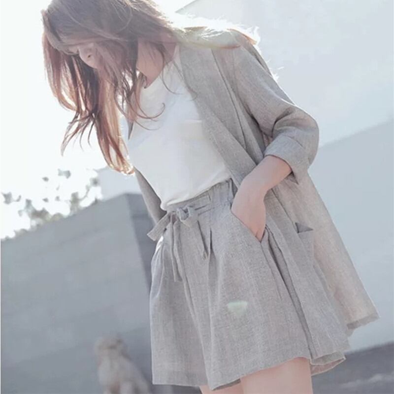 春 夏セットアップ レディース ライトグレーパンツスーツ ワイド ショートパンツ 2点セットジャケット ブレザー 麻 リネン スーツ おしゃれ オフィス 通勤 OL 40代 RB-R3-01-NK05-0006