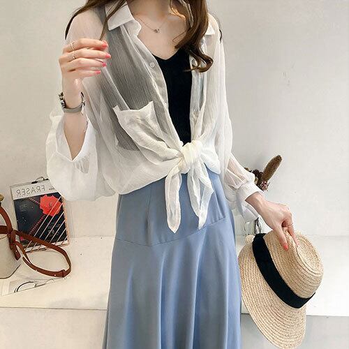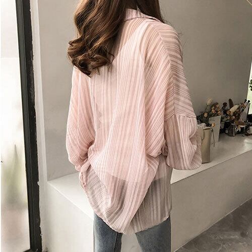シャツ ピンク ブルー ホワイト 長袖 若々しい 大きいサイズ シフォン レトロ 爽やか ミディ丈 ストライプ柄 ヤングレディー カジュアル ゆったり感 アクティブ 夏 20代 30代 40代 くすみカラー RB-R3-04-SA04-0097