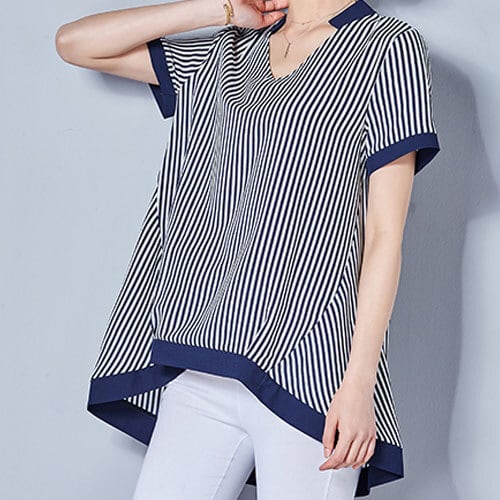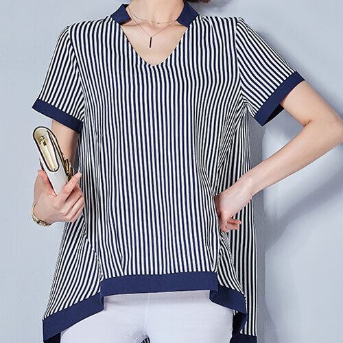 韓国風 ブラウス 2色 ポリエステル ゆったり感 ストライプ柄 Vネック 半袖 ミディ丈 爽やかな サマーバカンススタイル カジュアル アクティブ 夏 20代 30代 40代 くすみカラー RB-R3-06-SA04-0022
