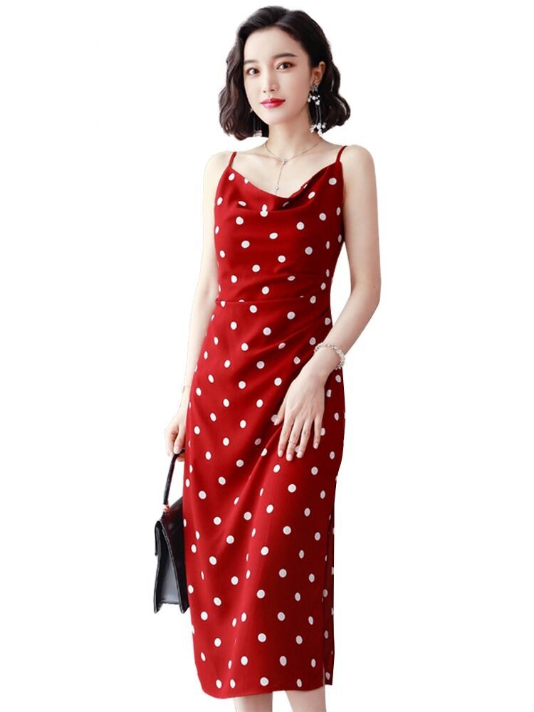 インナー 夏ワンピース キャミソール レディース インナー 夏 ロング シフォン 水玉 セクシー ノースリーブ Aライン おしゃれ 着痩せ キレイめ デート ブラック レッドRB-R3-01-NK05-0016