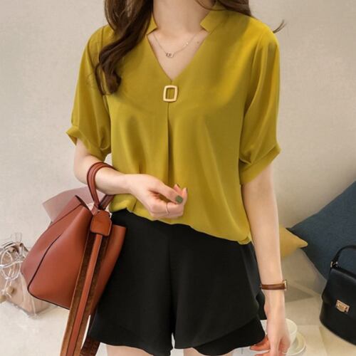 韓国風 ブラウス アプリコット レッド イエロー 半袖 ヤングレディー 爽やか シフォン 着痩せ カジュアル ポリエステル Vネック ゆったり 夏 20代 30代 40代 くすみカラー RB-R3-06-SA04-0031