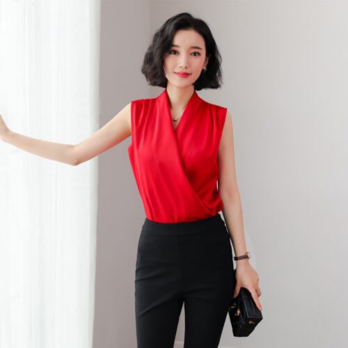 韓国風 ブラウス ブラック ホワイト レッド ナイロン ノースリーブ ゆったり Vネック ヤングレディー 涼しげ ミディ丈 軽快感 シフォン 清潔感 着痩せ ビジカジスタイル 夏 20代 30代 40代 くすみカラー RB-R3-06-SA04-0034