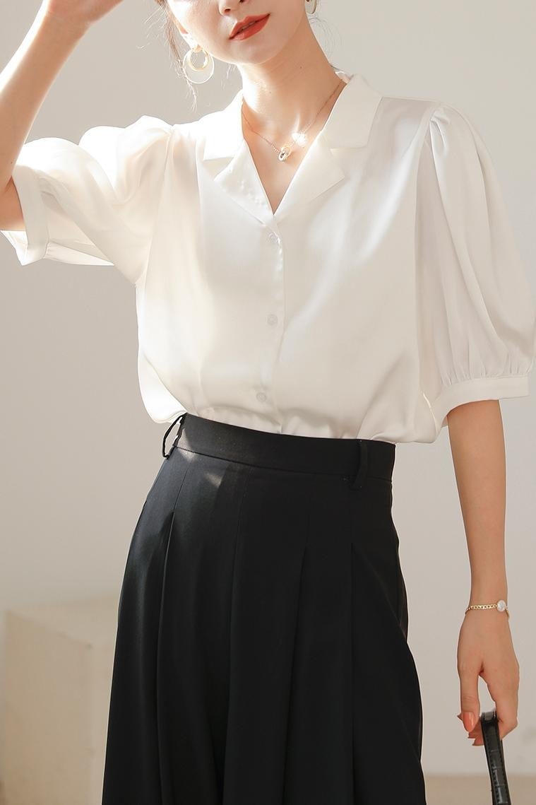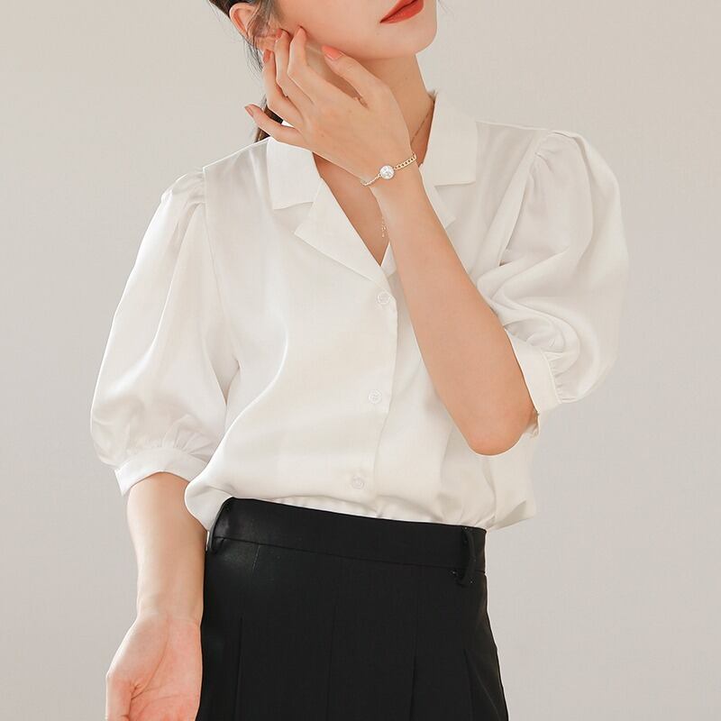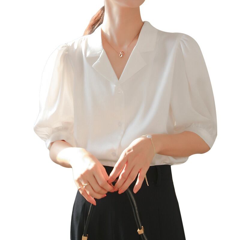 ブラウス レディース シャツ 夏 Vネック 半袖 白 ホワイト オシャレ パフスリーブ シルク風シャツ 上品 通勤 光沢感 大人 OL ゆったり トップス 20代30代40代