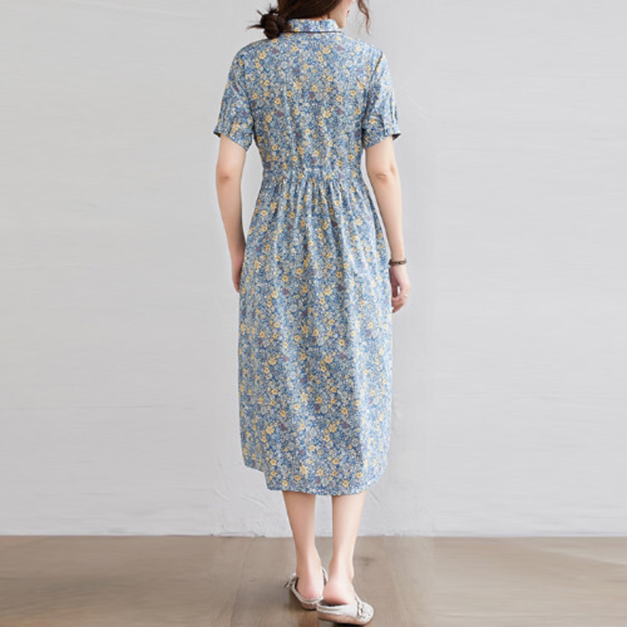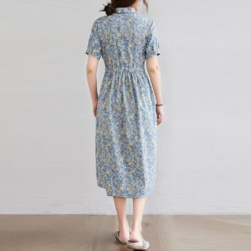 韓国風 ワンピース ブルー ベージュ ホワイト きれいめ ミディ丈 さりげないデザイン性 コンサバティブ 華やか 半袖 カジュアル 花柄 ヤングレディー 涼しげ ポロカラー ゆったり感 程よいフィット感 ラフな休日スタイル 夏 20代 30代 40代 くすみカラー RB-R3-06-SA04-0051