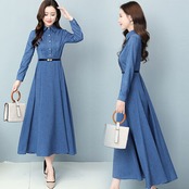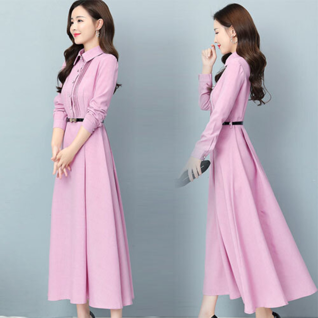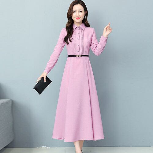 ワンピース ブラウン グレー ピンク グリーン ネイビー デニムブルー ウエストベルト付き ポリエステル ゆったり感 ミディ丈スカート 立襟 中ウエスト 長袖 ヤングレディー 華やか カジュアル 清潔感 柔らかコンサバティブ シンプルデザイン 夏 20代 30代 40代 くすみカラー RB-R3-06-SA04-0056