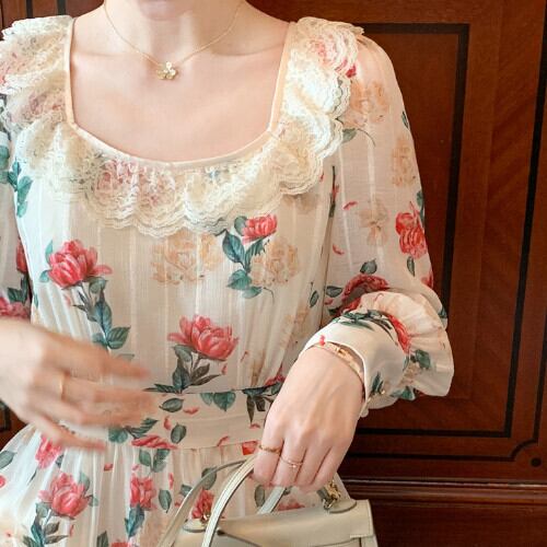マキシワンピース レディース ロング丈 長袖 Aライン 花柄 着痩せ きれいめ ホワイト 夏 20代 30代 40代 くすみカラー RB-R3-06-SA04-0061