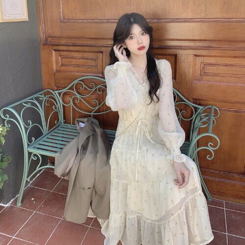 ワンピース シフォン Vネック ロング丈 薄手 ゆったり Aライン きれいめ 長袖 花柄 爽やか 夏 20代 30代 40代 くすみカラー RB-R3-06-SA04-0062