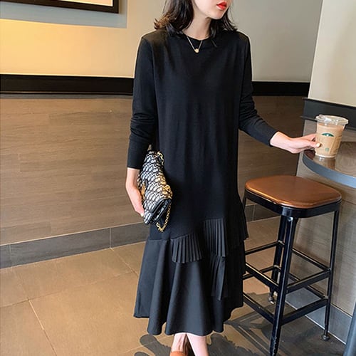 ワンピース クルーネック 長袖 ミモレ丈 カジュアル プリーツスカート シック 大人 ブラック 夏 20代 30代 40代 くすみカラー RB-R3-06-SA04-0066
