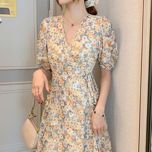ワンピース レディース きれいめ 膝丈 フレア 花柄 シフォン 着痩せ Vネック 半袖 Aライン フェミニン 夏 20代 30代 40代 くすみカラー RB-R3-06-SA04-0098