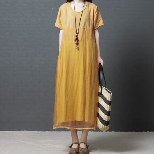 ワンピース レディース ロング丈 リネン 半袖 Uネック ネイビー イエロー 無地 ゆったり 夏 20代 30代 40代 くすみカラー RB-R3-06-SA04-0088