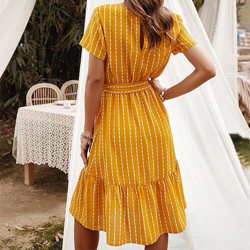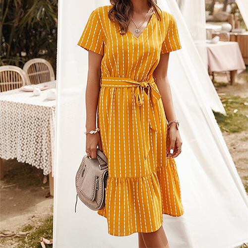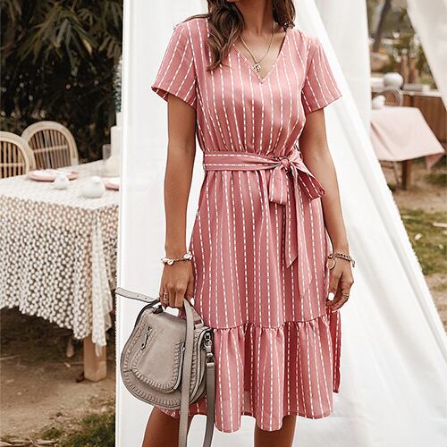 韓国風 ワンピース レディース Vネック 膝丈 半袖 ウエストリボン 着痩せ ストライプ お出かけ 夏 20代 30代 40代 くすみカラー RB-R3-06-SA04-0084