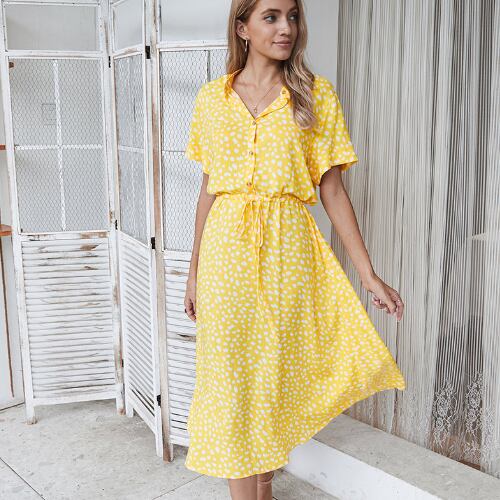 韓国風 ワンピース レディース マキシ ロング丈 ドット柄 シャツワンピース Aライン 半袖 着痩せ 夏 20代 30代 40代 くすみカラー RB-R3-06-SA04-0085
