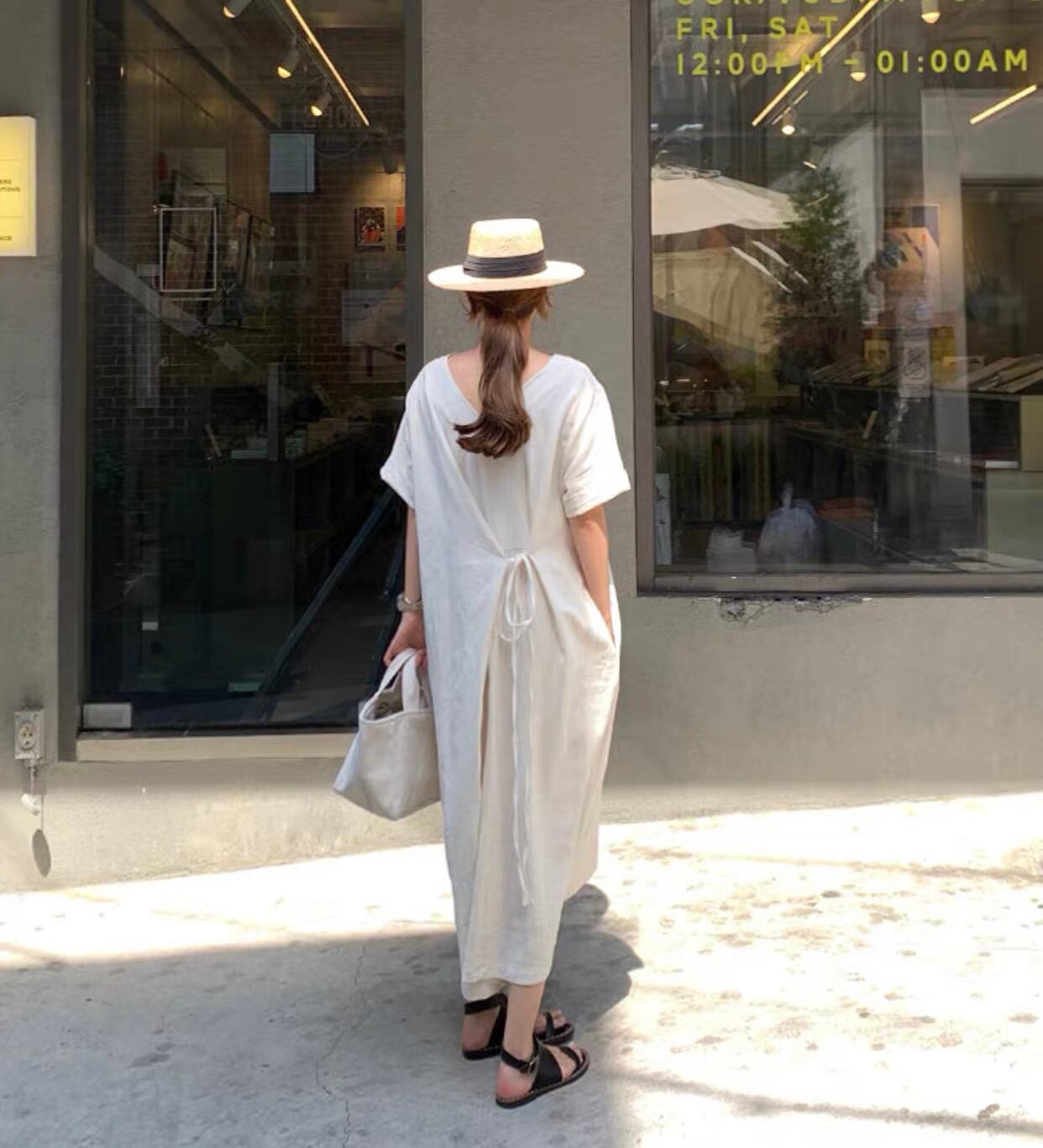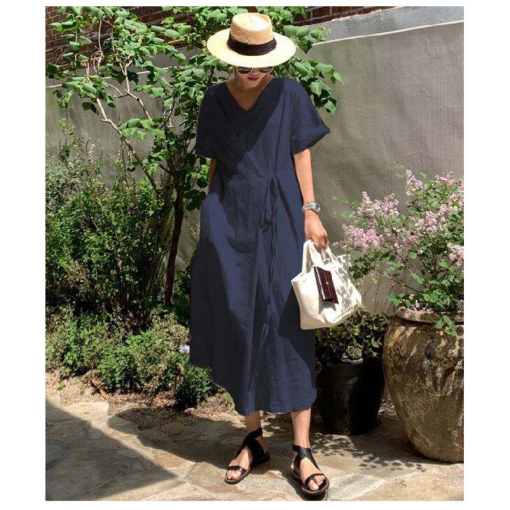 韓国風 ロングワンピース 前後 両着 2way マキシワンピース Vネック 半袖 紐 レディース シンプル 無地 春 夏 RB-R3-12-CN05-0013