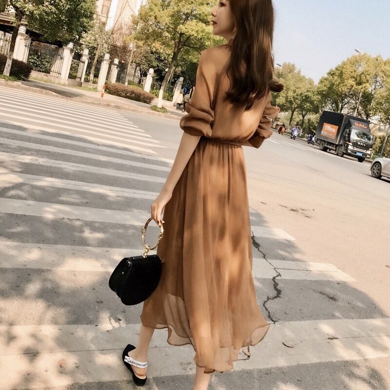 人気ワンピースレディース春夏ロングワンピース40代大きいサイズシフォンワンピース長袖Aラインワンピースハイウエストマキシワンピ通勤OL着痩せRB-R3-01-NK05-0043