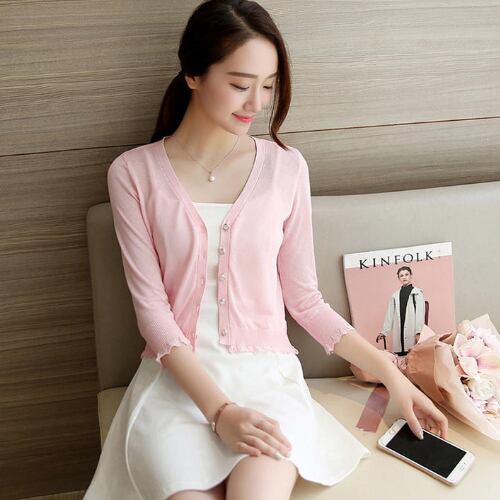 韓国風 カーディガン サマーニット Vネック 七分袖 冷房対策 接触冷感 紫外線対策 薄手 体型カバー 6色 夏 20代 30代 40代 くすみカラー RB-R3-19-SA05-0036