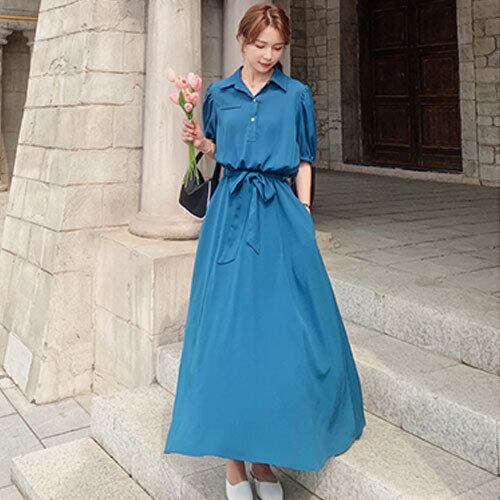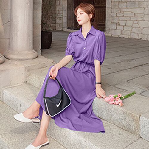 ワンピース 半袖 ロング丈 体型カバー パフスリーブ ゆったり パープル ブルー 夏 20代 30代 40代 くすみカラー RB-R3-19-SA05-0049