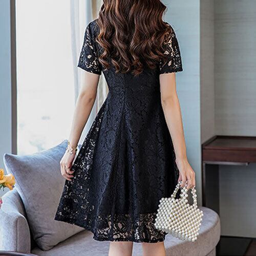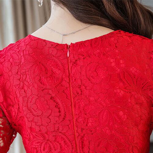 ワンピース ミディアム丈 レース Vネック 着痩せ レッド ネイビー ブラック 夏 20代 30代 40代 くすみカラー RB-R3-19-SA05-0060