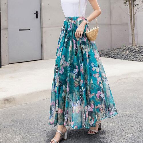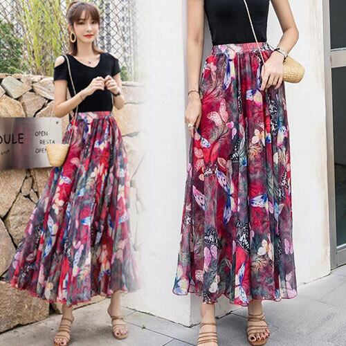 スカート マキシ丈 シフォン 花柄 フレア プリーツ 8色 夏 20代 30代 40代 くすみカラー RB-R3-19-SA05-0067
